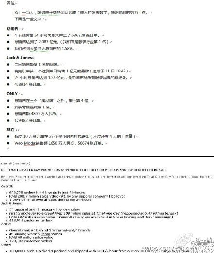 这是2011年双11的数据,当时绫致在天猫也是销售收入排在前三位的服装类品牌,绫致究竟是能力不及还是投入不够?有微博主@李文功 评论称:作为了解内情的行业人士,偶可以负责任地讲,绫致的信息系统相当落后,只是他们的商业模式不是精细化管理,而是"卖货、卖货再卖货"而已。