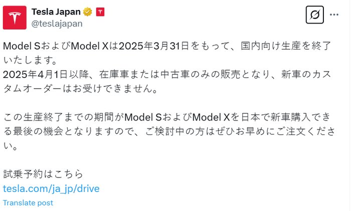 据东方财富网,特斯拉日本3月6日宣布,将于3月31日停止面向日本市场生产Model S和Model X,4月1日起仅销售库存车或二手车,不再接受新车订单。