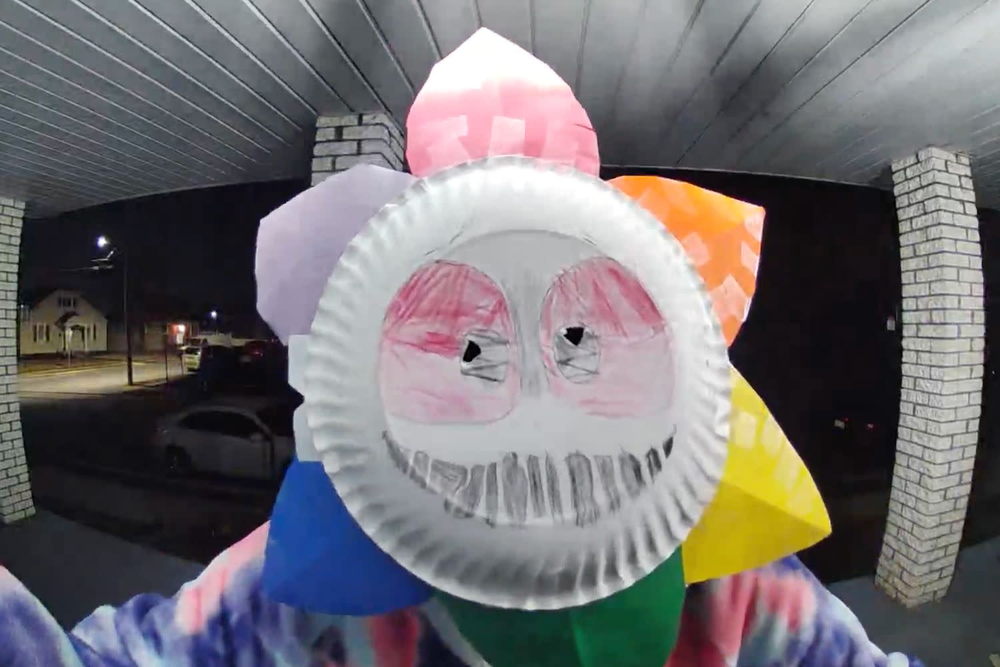 警方公布了这段视频和一张“盒子恶魔”的照片。“盒子恶魔”戴着一个纸盘面具,牙齿大大的,咧着大嘴笑,不禁让胆小的众人想起著名恐怖电影《小丑回魂》。可以看到,男子用剪成花瓣的彩色卡纸和扎染连帽运动衫装饰面具,完成了整个“盒子恶魔”造型。