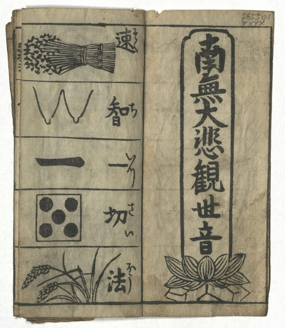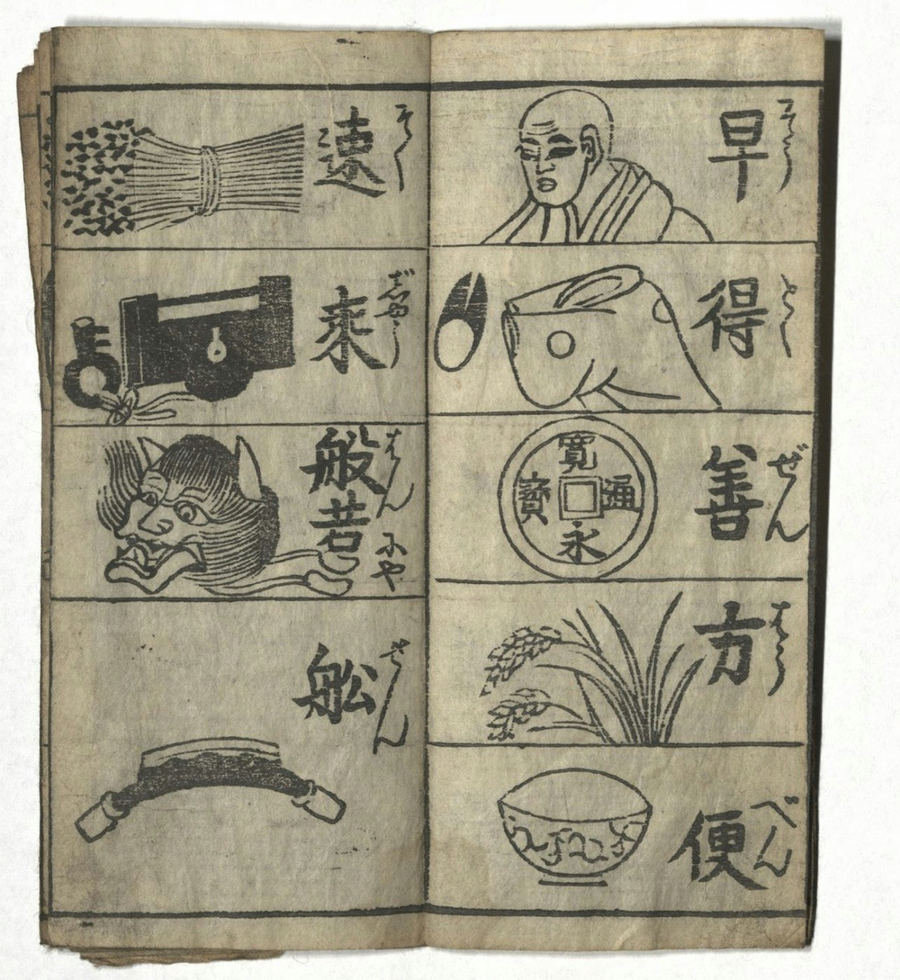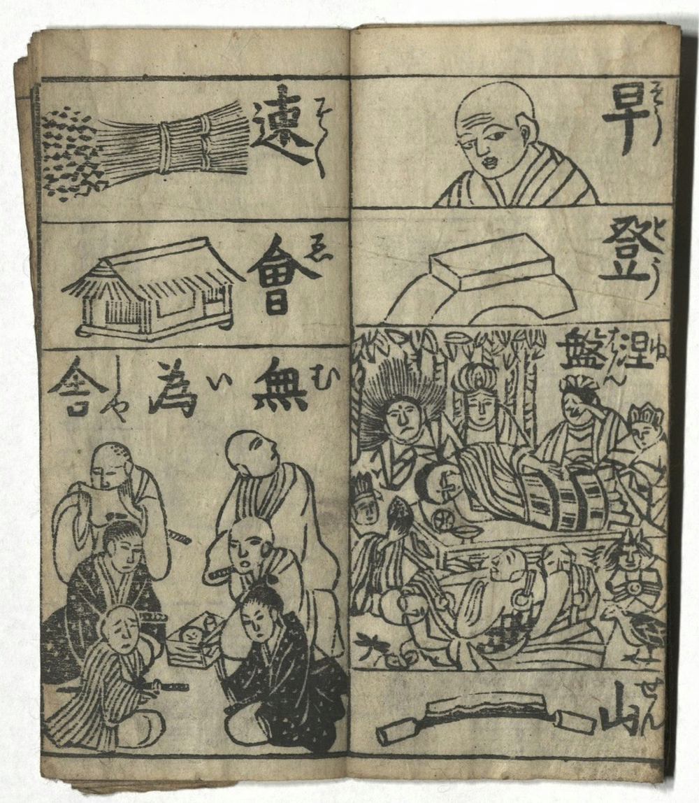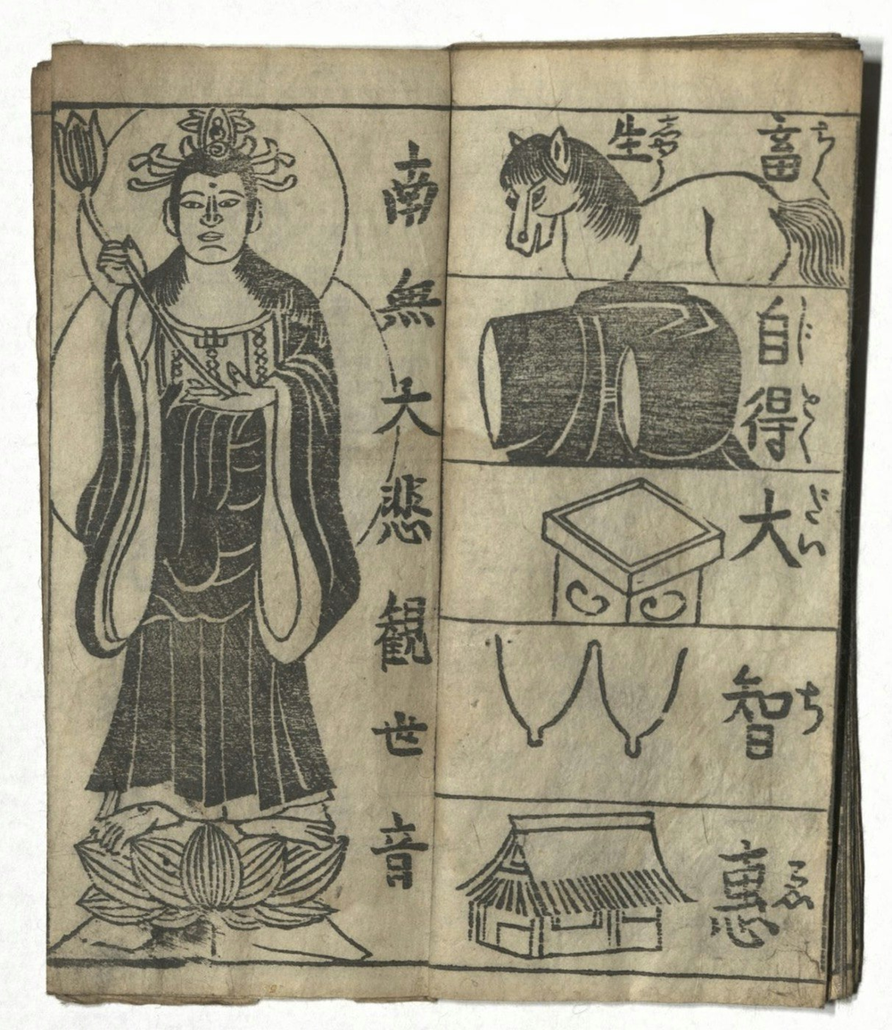 基于此,从17世纪开始,日本印刷商开始为文盲制作制作佛经,这些佛经通过象形文字表述,只需要按照日语词汇念出来并组合在一起,就能像僧人一样念经了。