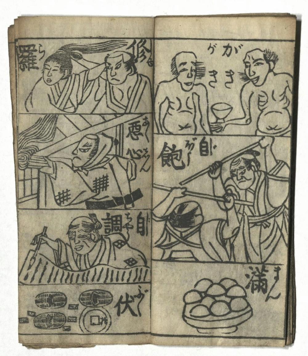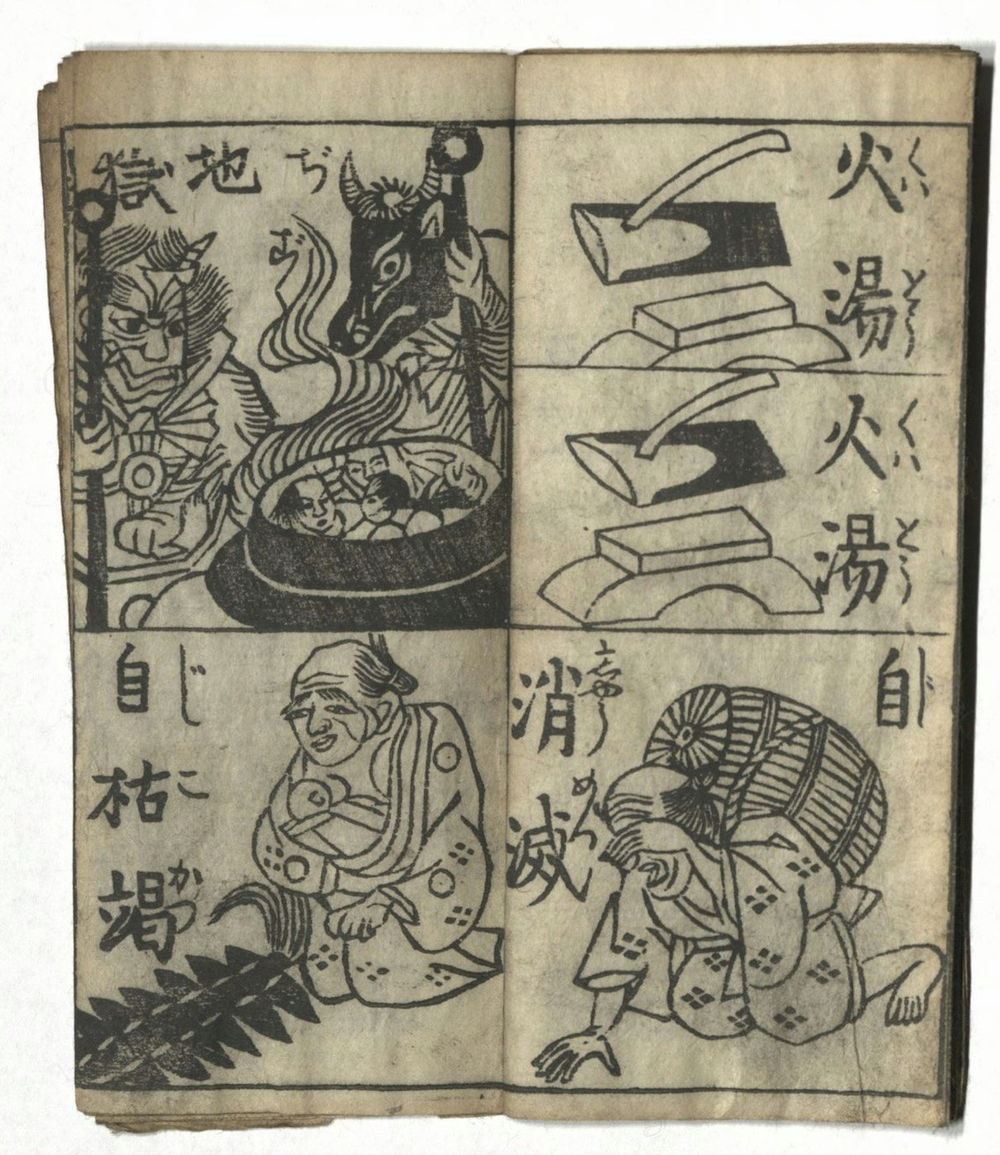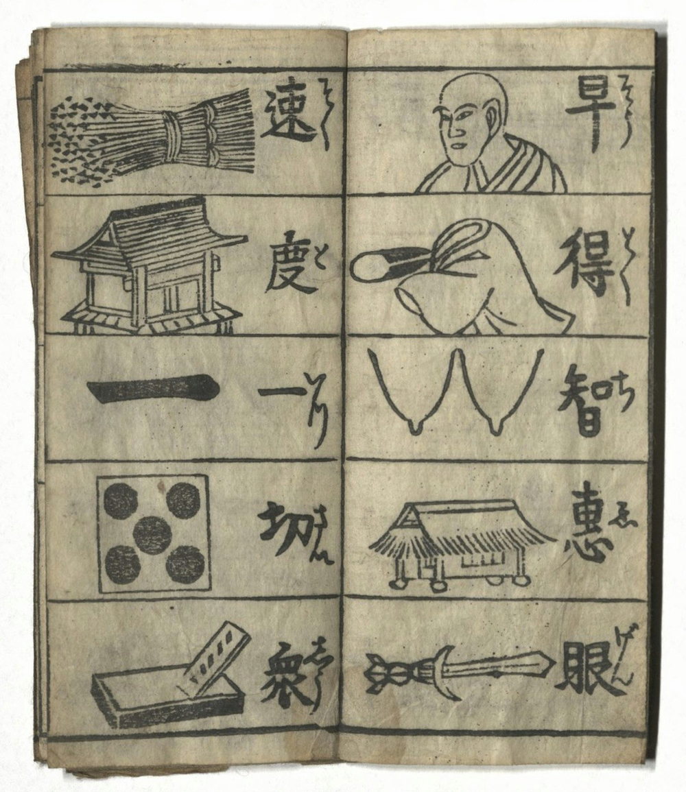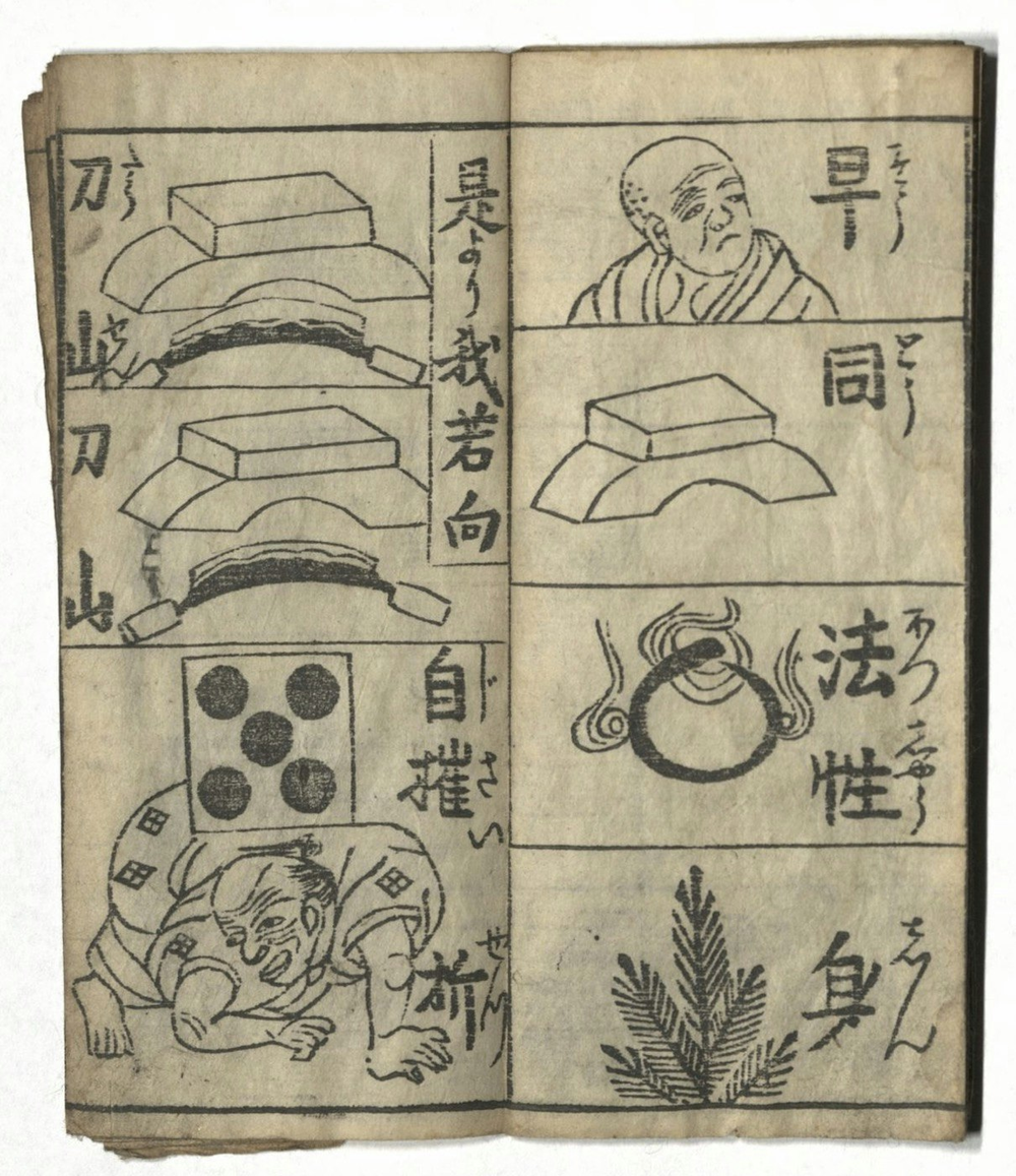 基于此,从17世纪开始,日本印刷商开始为文盲制作制作佛经,这些佛经通过象形文字表述,只需要按照日语词汇念出来并组合在一起,就能像僧人一样念经了。