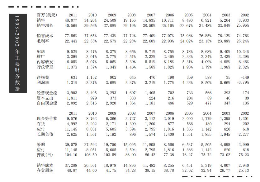 其经营现金流入增长是很稳定的,而且还超过盈利数字很多很多。尤其是从09年起,由于对供应链的把握能力加强了,其应付款周期再次延长到100天以上,虽然存货周转率下降了,可是其经营现金流整整提升了100%。这么强大的现金流,就连投资也无法完全消化,致使其自由现金流也不断升高。多余的现金,自然是先去还债了,所以这期间的长期债务呈下降趋势,随之下降的是其利息费用。