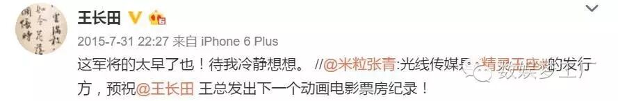 有意思的是,同样是光线在今年暑期档发行的两部动画电影,在光线传媒总裁王长田的微博上,以“大鱼海棠”为关键词可以搜索出12条微博,但以“精灵王座”为关键词的微博,只能搜索出两条,其中一条还来自于2015年7月。