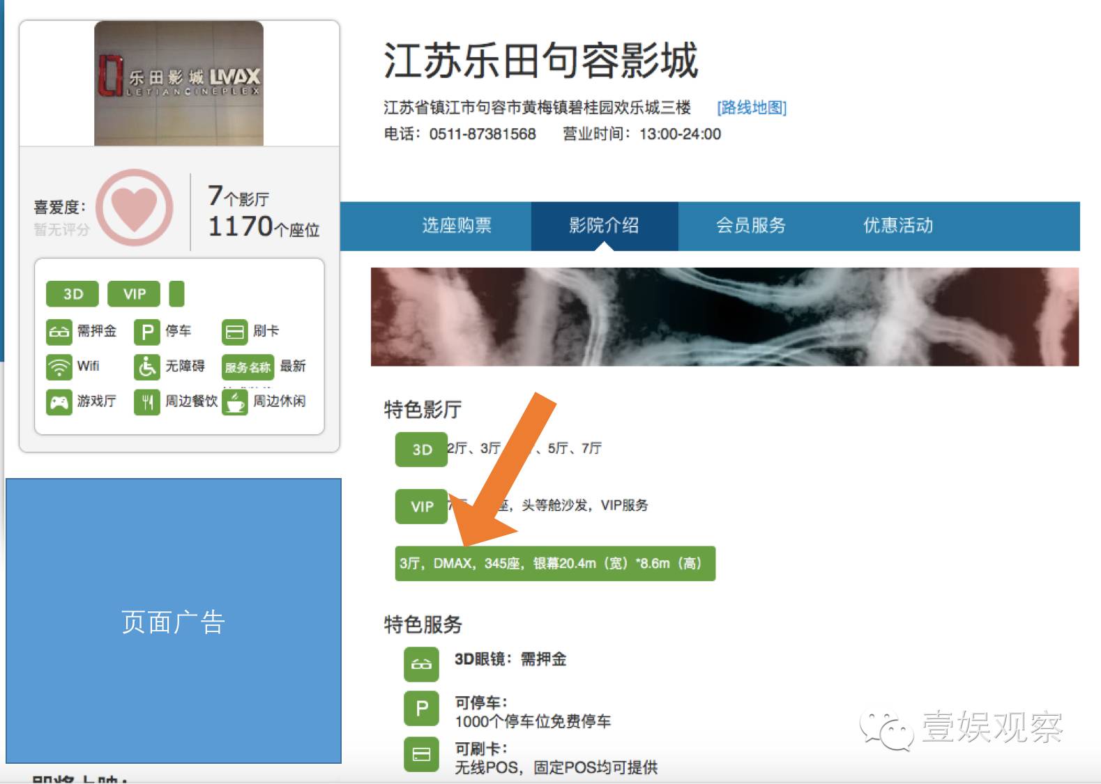 在该影城的时光网影讯上,显示影城的3号影厅为“DMAX,345座,银幕20.4m(宽)*8.6m(高)”。壹娱观察记者注意到,该影城目前已经开始用L-MAX来进行宣传,在记者打电话询问时,工作人员只是声称有巨幕,且目前正在改造,但是并不清楚是否是中国巨幕,随后记者问询网上看到宣传是DMAX,该工作人员表示具体需要问其他工作人员。