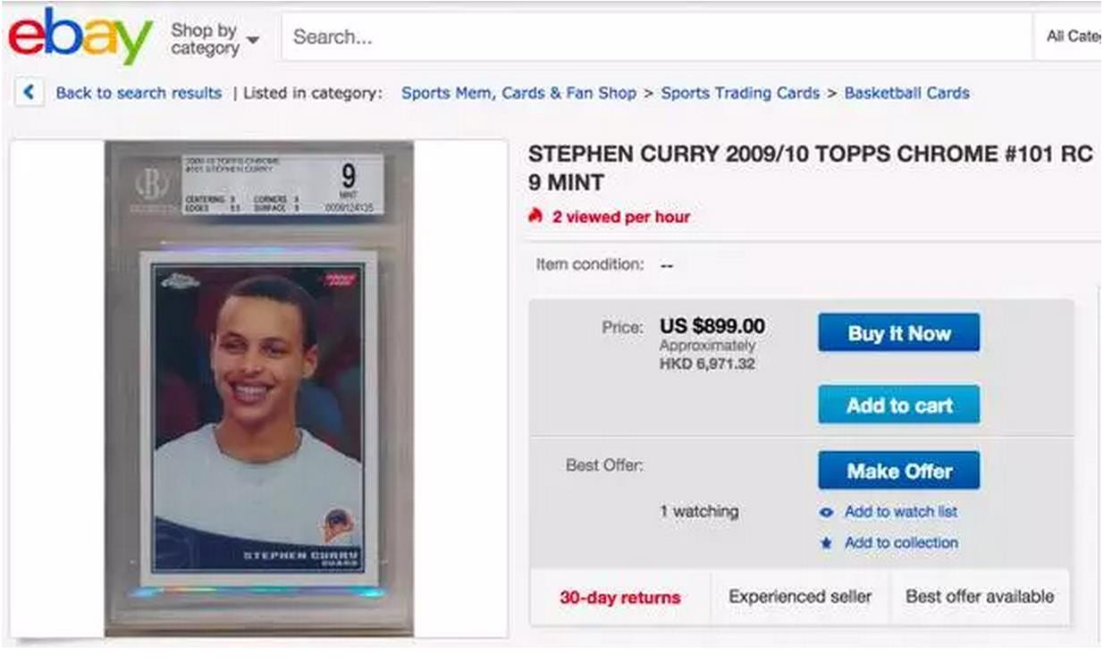 拿NBA球员卡来说,球员的受欢迎程度、卡片发行量以及发行时间等因素,都直接影响着球员卡的身价。有球员亲笔签名或球衣切片的球员卡更是身价倍增。在全球市场,Ebay是卡迷们进行单卡交易的最大二级市场,单卡交易价格在Ebay上会有持续快速的波动,供卡迷做交易参照。