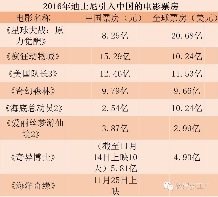 在北美票房排行榜上前十电影中,迪士尼的《海底总动员 2》、《美国队长 3》、《奇幻森林》和《疯狂动物城》分别位列第一、第二、第四和第六位。其中中国市场做出了不小的贡献——2016年引入中国的迪士尼影片达到了8部,超过以往任何一年。