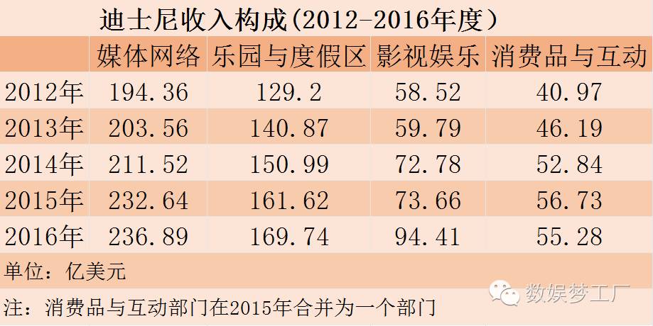 整个2016财年,影视娱乐业务收入达94.41亿美元,在总收入中占比为16.97%,是近年来占比最高的一次。