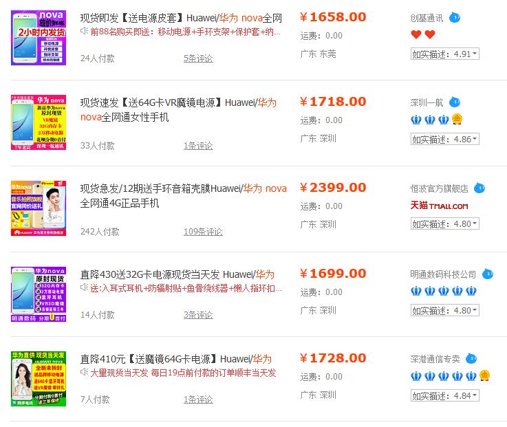 需要注意,这并不是国美商城官方销售的手机,而是来自第三方卖家。如果来自第三方,那为何不看一下淘宝呢?在淘宝上,我们发现了大量售价在1700元上下的华为Nova卖家,标榜为全新未拆封国内行货,并往往搭配一系列赠品销售。截图中的价格并不是卖家为了吸引点击设置的无法购买的套餐,而是实际可以购买的真机售价。