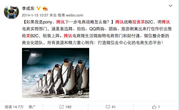 而东哥则是在调整架构后的6月底加入腾讯电商的战略投资中心,直到2014年3月腾讯战略入股京东,进入京东战略部。腾讯电商高管,大部分选择了再次创业,部分进入京东体系后又离开了。