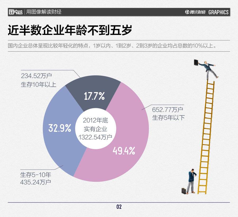 (原文来自腾讯财经)日前,国家工商总局发布全国内资企业生存时间分析报告,通过综合分析2000年以来全国新设企业、注吊销企业生存时间等数据,总结了我国企业生存时间方面呈现的主要特点:一、近五成企业年龄在5年以下。截至2012年年底,我国实有企业1322.54万户。其中,存续时间5年以下的企业652.77万户,占企业总量的49.4%。二、企业成立后3年至7年为退出市场高发期,即企业生存的“瓶颈期”。2000年以来新设立企业退出市场的概率呈倒“U”型分布,即前高后低、前快后慢态势。企业成立后的3年至7年死亡率较高。三、多数地区企业生存危险期为第三年。企业成立后第三年死亡数量最多,死亡率达到最高,达到9.5%。