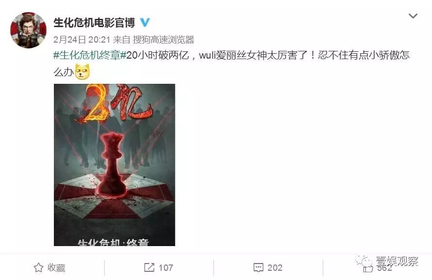 “出乎意料”、“没想到”是在壹娱观察对影院经理包括片方两位负责人的采访中频繁被提到的字眼。《生化危机6》72小时票房为6.35亿,这比已破10亿的《极限特工:终极回归》的72小时票房4.22亿成绩还要高出50%,比《长城》的72小时票房4.72亿还要高出近35%。