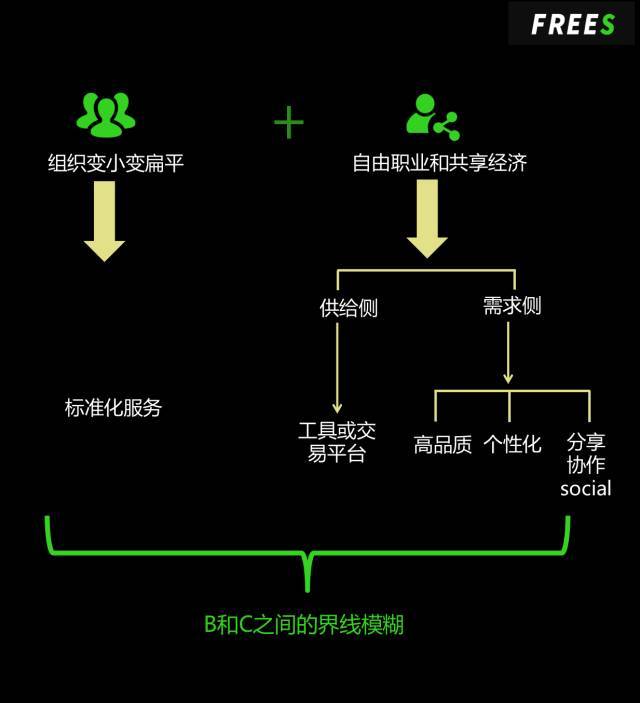 组织变小变扁平导致共性需求更多,因此做标准化的服务和产品更有可能。自由职业和共享经济的兴起,从供给侧来讲,当自由职业的供给多起来,会出现对应的工具和交易平台;从需求侧来讲,组织变小,人变年轻,就要求个性化、高品质的服务或产品,也更加看重分享、协作和 Social 功能。