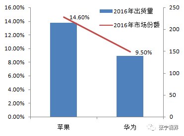 2016年,苹果、华为的市场占有率分别为14.6%、9.50%。趋势上,2016年华为同比市占率提升30%,而苹果则下降7%。