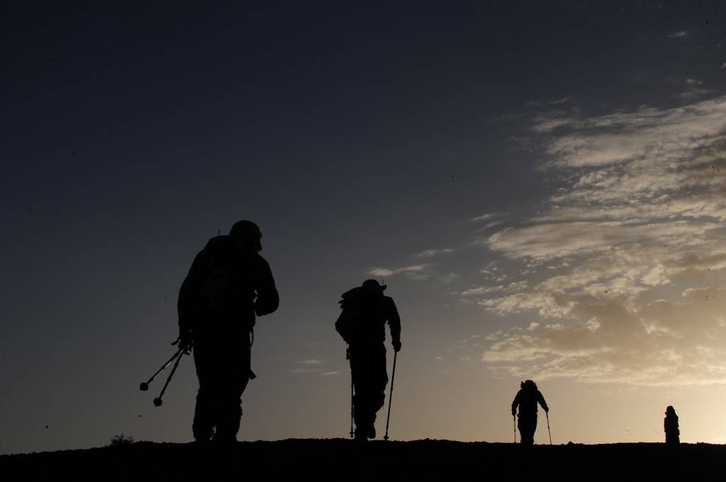 归总历来戈壁上的徒步者,可分为两类:一类,他们真是来走的,争夺金牌,低头赶路,唯快不破;第二类则是来体验的,不以拿金牌为目的,战术上主张量力而行,在游刃有余与精疲力竭之间寻得一种最适宜自己的状态,抵达终点亦是战术上的一个阶段性目标。