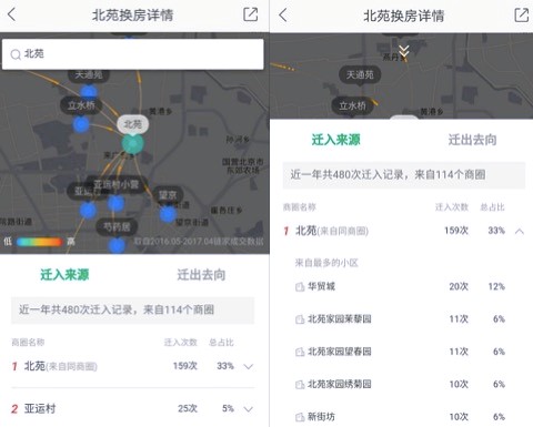 据了解,大部分人更愿意在同商圈内换房,以便有效降低他们适应环境的时间成本。以北苑商圈为例,该商圈近一年共有480次迁入,共来自114个小商圈。其中,北苑商圈内部迁徙占比最高达到33%。