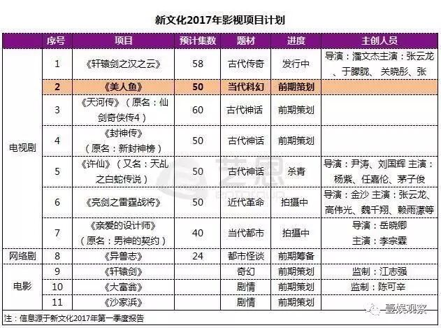 根据新文化2017年影视项目计划,《美人鱼》预计集数50集。在剧集的宣发层面,王晓晖透露,《西游·降魔篇》是台网都有权利;而《美人鱼》的权利在电视台那边,爱奇艺则会在新媒体上操作。