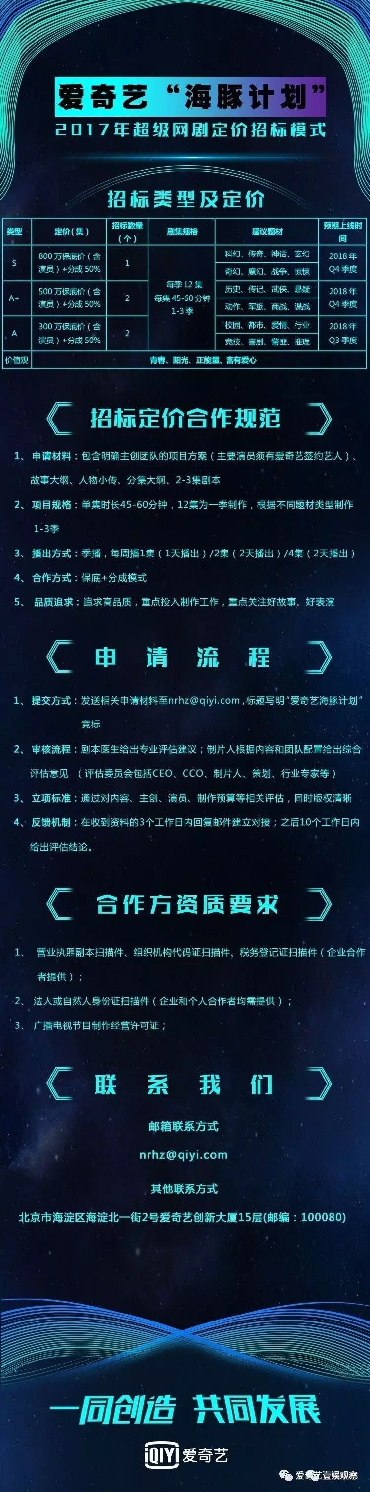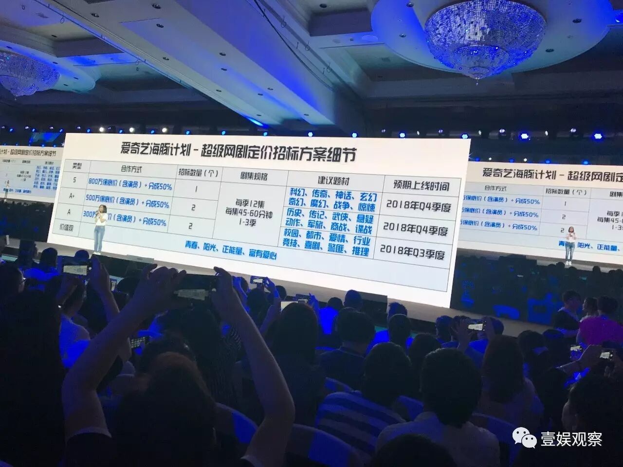 昨日,在“剧浪时代-中国网络剧发展高峰论坛”现场,爱奇艺也首次公布了定框架定价超级网剧招标计划——“海豚计划”,以及针对制片人和演员的“幼虎计划”、“天鹅计划”。