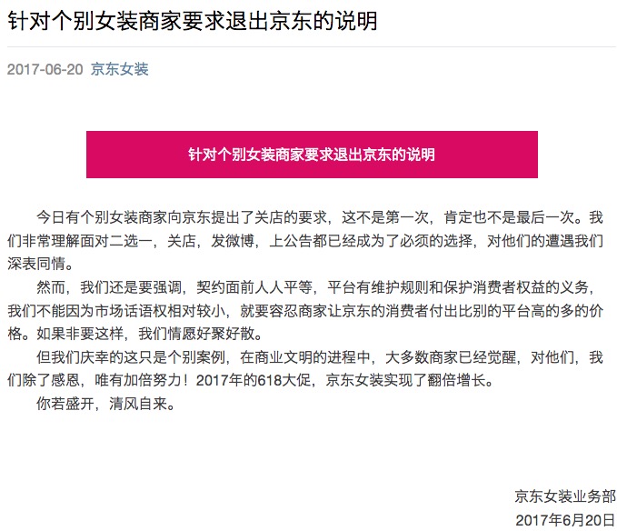 对此,京东女装官方微信公众号在今日进行了间接回应:表示对卖家“二选一”关店、发微博,深表同情。同时表态,“好聚好散”。