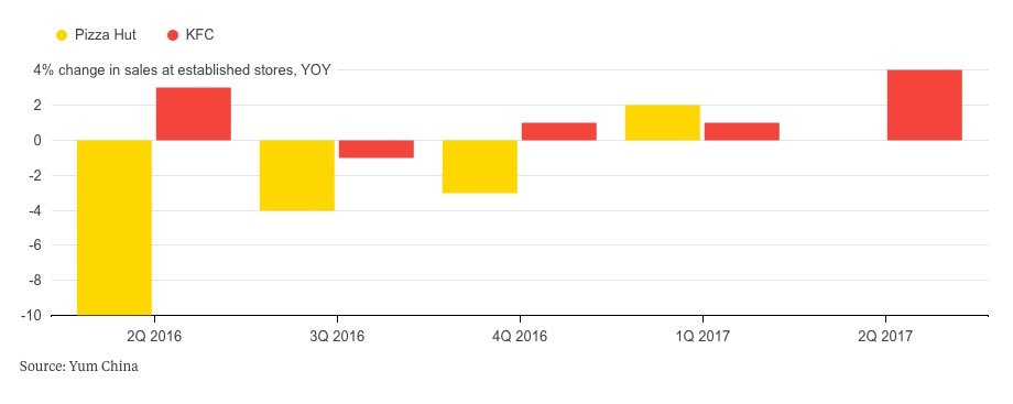 事实上,在百胜中国第二季整体录得3%的同店销售额增长时,必胜客的销售额却是与去年同期持平的,并没能达到Consensus Metrix预测的增长1.5%。