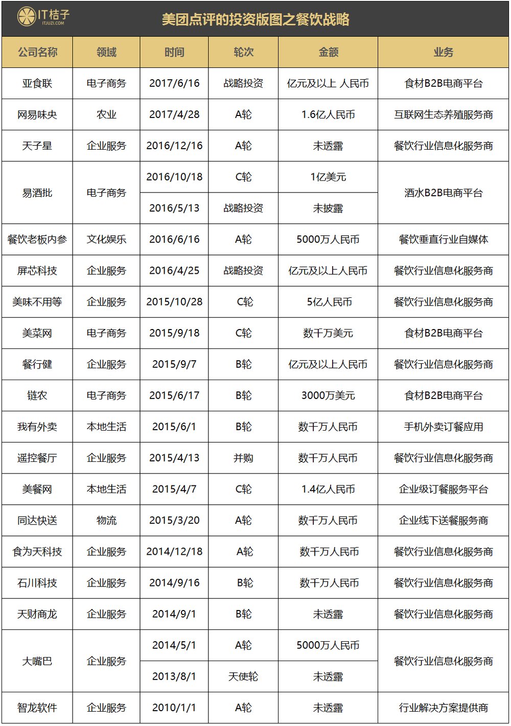 在接触末端消费者方面,美团点评投资了为大型连锁餐饮企业提供线下送餐服务的「同达快的」,企业级送餐服务平台「美餐网」,以及手机外卖订餐应用「我有外卖」。