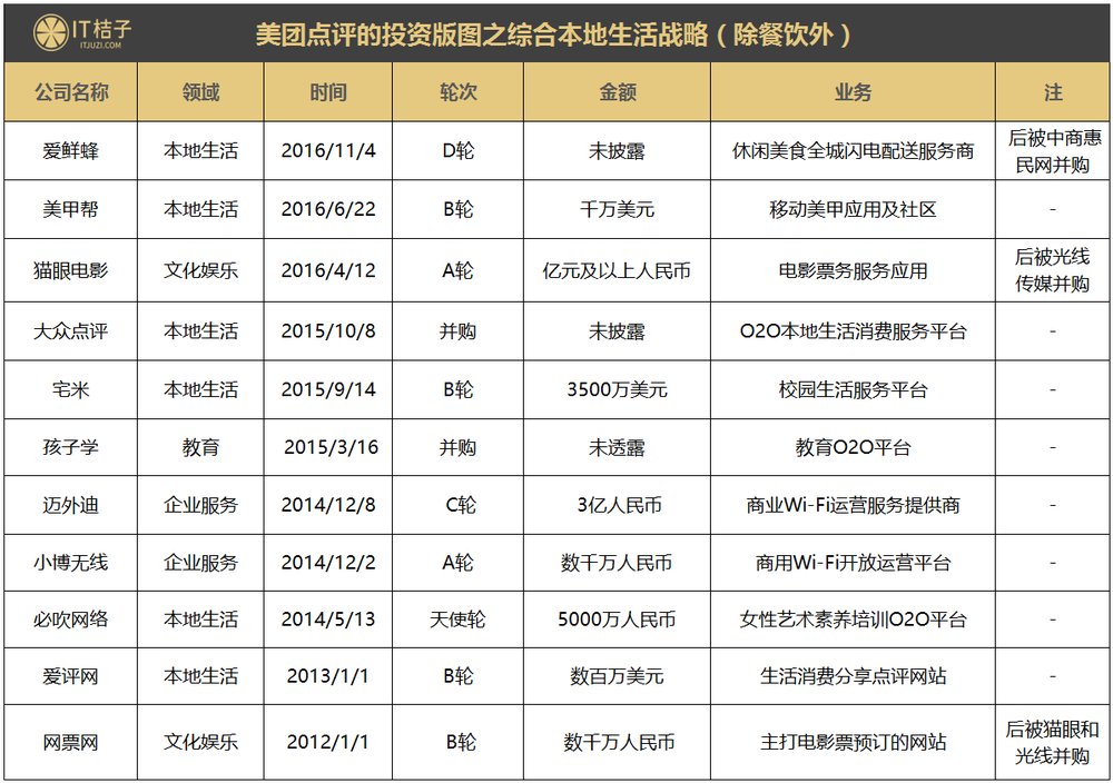 除此之外,美团点评在生活服务方面通过投资并购,涉足了很多领域,包括:台湾的生活消费分享点评网站「爱评网」、女性艺术素养培训 O2O 平台「必吹网络」、商用 WiFi 运营服务商「小博无线」和「迈外迪」、教育 O2O 平台「孩子学」、学校生活服务平台「宅米」、移动美甲应用及社区「美甲帮」、以及休闲美食全城闪电配送服务商「爱鲜蜂」(后被中商惠民网并购)。
