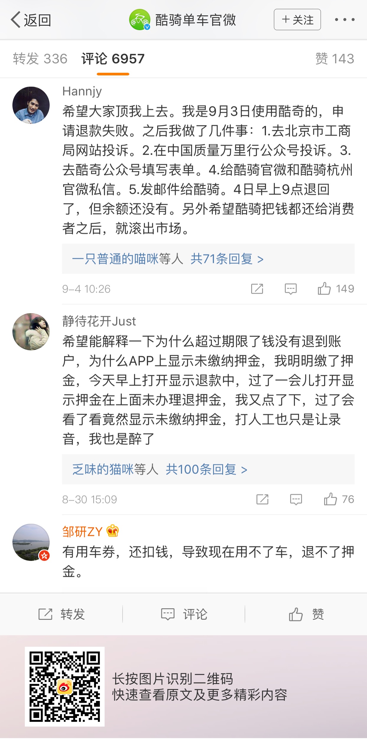 对此,酷骑在8月30日给出的官方解释也是:退款困难是由于技术和系统升级等原因导致,预计将于9月底彻底解决。但用户似乎并不买账,在官方微博发布的通知下面,几乎所有用户众口一词指出这个原因只是拖延借口。