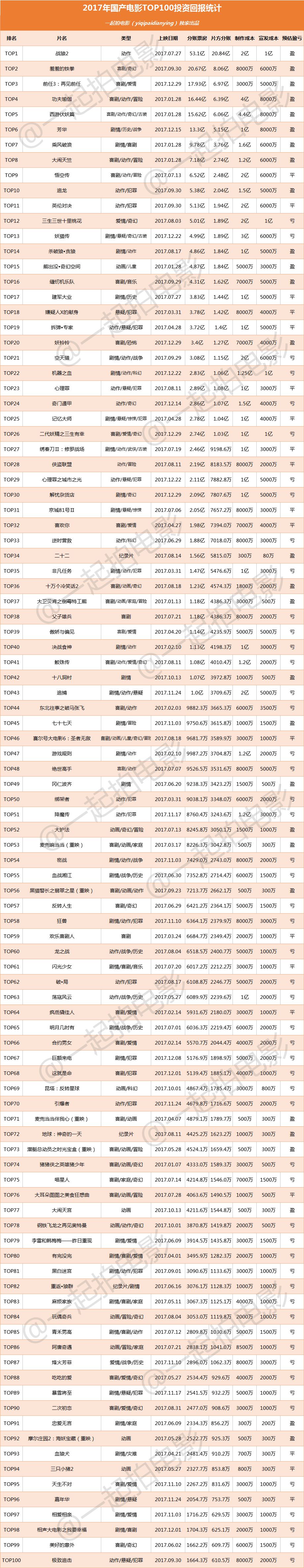 一起拍电影通过走访调查、数据整理,统计出2017年国产电影TOP100的盈亏现象表。