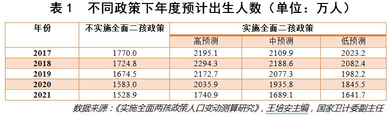 尽管二胎政策已经放开两年,但中国的生育率还是出现了走低趋势。根据国家统计局的数字,2017年我国出生人口与生育率分别为1723万人和12.43‰,两个指标双双下跌,其中出生人口远低于国家卫计委的预测数值(参见表1)。