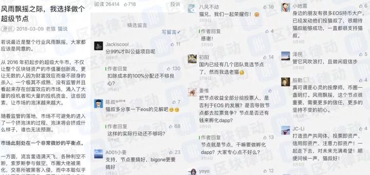 老猫在自己的公众号发文《风雨飘摇之际,我选择做个超级节点》,开始了拉票,将向支持老猫节点的大佬们返还节点收益,也就是分红。一个节点每年可以获得 238 万个 EOS 的收益,稳赚不赔的好机会,当然给投一波币。于是乎,大家纷纷看好老猫的节点。