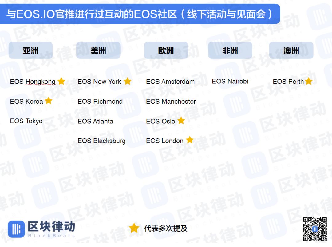 从社区认可度这方面来看,中国节点在 EOS 社区的存在感远远不及美国和韩国。自从 EOS.IO 的官方 Twitter 上线以来,从来没有跟中国大陆的 EOS 社区进行过互动,与 EOS.IO 官推进行过活动和互动的社区见下图。