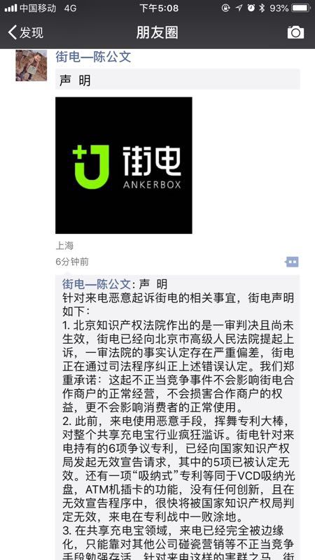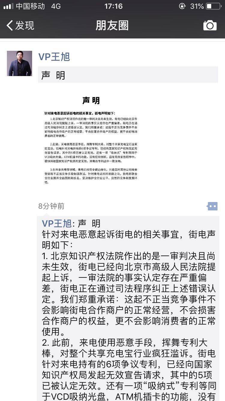 正当舆论一片哗然之际,街电给出自己的反应——朋友圈抗议,重提专利恶性起诉和不正当竞争概念,街电已经提起上诉,并坚持称来电会在专利战中一败涂地。