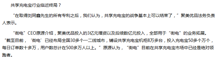 聚美优品的法务负责人也扬言,“在取得刘同鑫先生的所有专利之后,我们认为,共享充电宝的战争基本上可以结束了。”现在再回过来看,这句话恐怕说的有点早了。