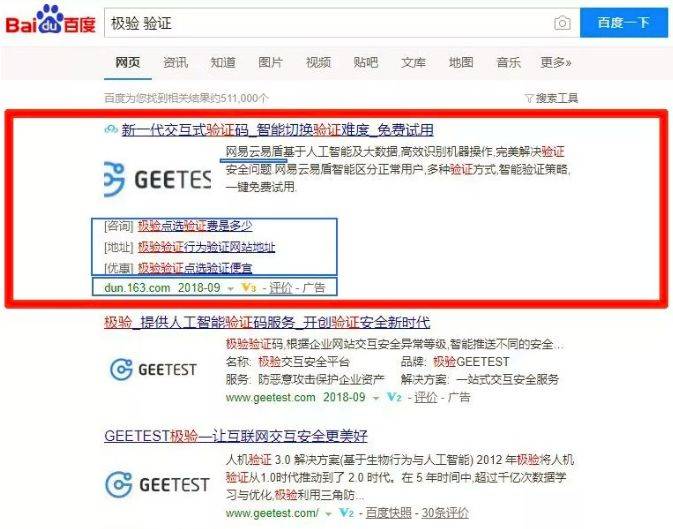 该技术人员透露,搜索引擎是不会自动给网易加上极验LOGO的。网易云易盾在百度展示页显示极验的LOGO,要么是网易买了极验的关键词广告,要么是使用了搜索引擎优化,这是网易主动去做的事情。