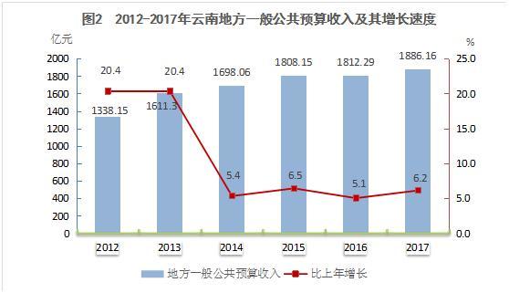 从上图可以看出,过去五年云南的工业产值从15.7%到6.6%大幅波动,浮动值为9.1%,而贵州只有4.1%。这种波动影响了云南经济增长的稳定性,当然也影响了财政收入。2014年云南的财政收入增速,直接从前一年的20.4%,断崖式下跌到了5.4%。