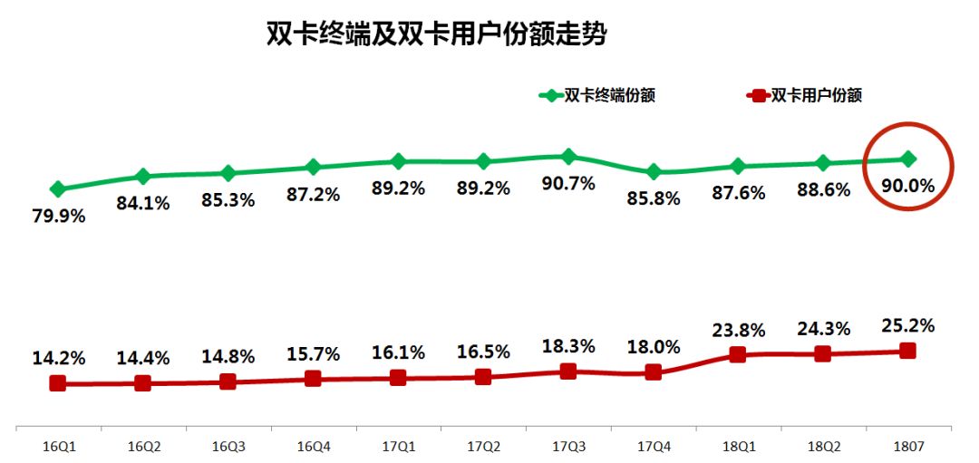 “双卡手机”在中国手机市场占据近90%市场份额,最近发布的2018年iPhone三款新品,其中有两款是专供中国市场物理实体卡槽“双卡手机”,按此发展趋势,“双卡手机”将全面覆盖中国手机市场。
