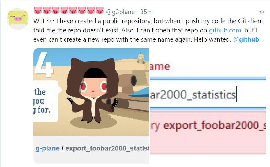 “见鬼???”,一位 Twitter 用户评论道,“我创建了一个公共存储库, 但当我敲下代码时, Git 客户端告诉我存储库不存在。此外,我无法打开http://github.com 中的存储库 ,甚至不能创建一个新的同名存储库。我需要帮助@GitHub。”