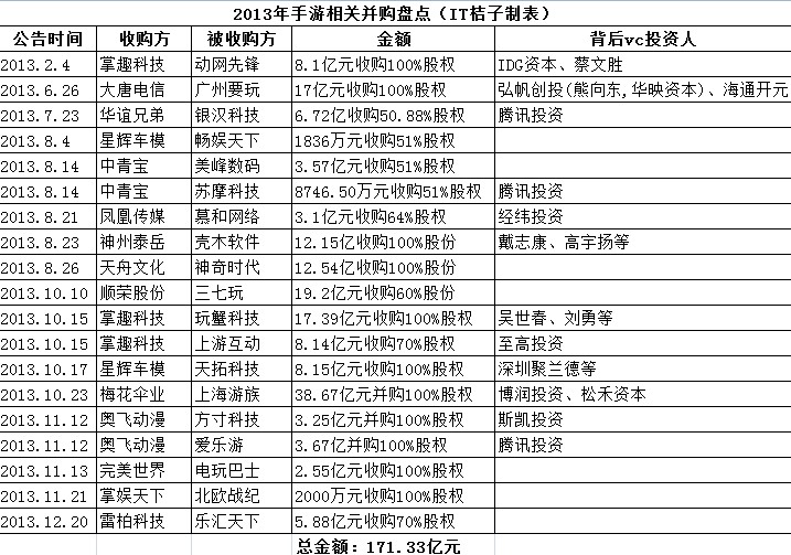 前面提到的是月流水来衡量手游业绩和成绩,在2013年还必须要提到的是收购、套现,这恐怕是刺激很多人进入手游领域创业的直接动力之一。盘点IT桔子的数据库,与游戏相关的收购事件达到19起,总金额达到171.33亿元,当然大多数都有业绩对赌,不过估计那些大手笔收购手游公司、加上手游题材的A股公司应该从股票上涨的幅度中收回了成本。一起来看看2013年有哪些大的手游收购套现: