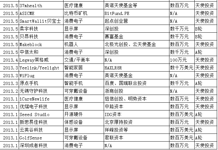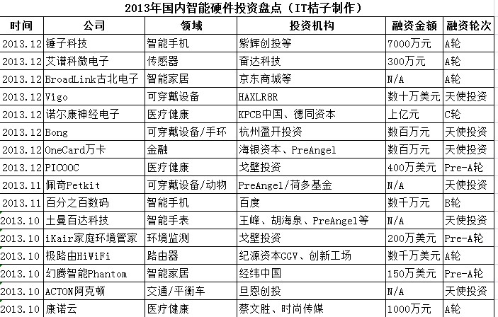 硬件因为涉及到产品、采购、供应链等,其成本相比很多领域都要高一些,如果没有足够的资金储备,很容易在一些环节断链子。回顾IT桔子的投资数据库,在智能硬件领域可公开的投资数据库包括48起投资,可以看到大多数还在天使投资-A轮的早期,很多相关公司的产品也都在打磨阶段、没有正式的发布或者量产,这样的话2013年更多在储备阶段,可能2014年有一些产品有机会脱颖而出、得到资本更多的追捧。