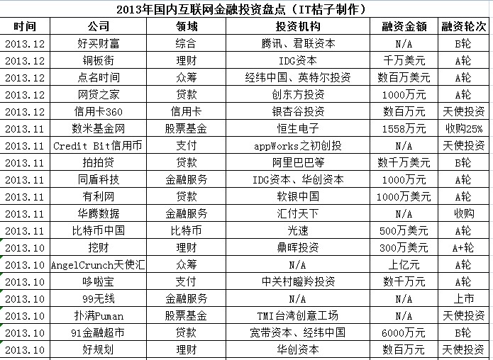 互联网金融是2013年最为热门的细分领域之一,从支付宝、余额宝,到供应链金融;从P2P借贷、众筹,到比特币、理财服务,互联网和金融这两个最为活跃的领域融合到一起,吸引着大家的眼球,也引领了很多创业者和投资人进入这个领域。IT桔子数据库在2013年收录了超过360家的创业公司、超过48起的互联网金融投资事件。
