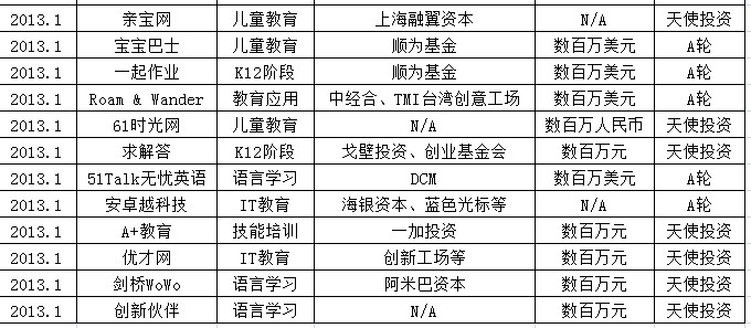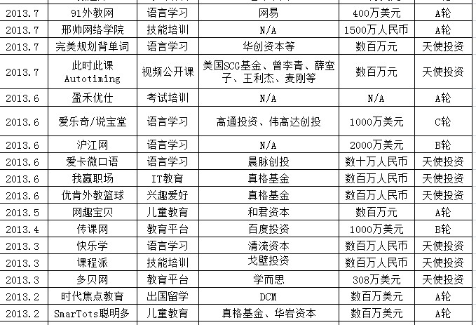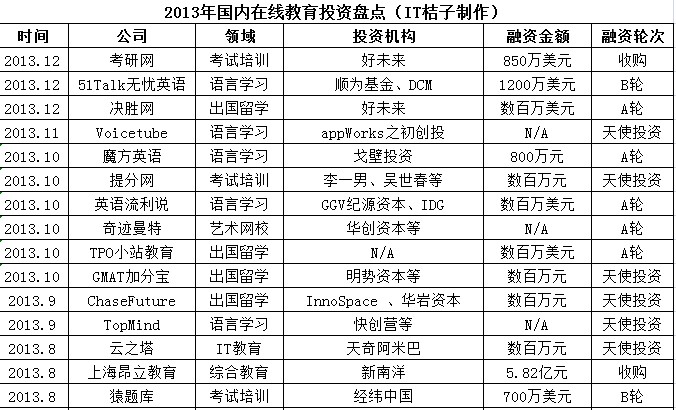 IT桔子的数据显示,2013年在线教育领域公开的投资案例有45个,而且投资方除开主打财务投资的VC结构之外,百度、腾讯、阿里巴巴、网易、学而思等互联网和教育机构也开始布局在线教育领域的投资。