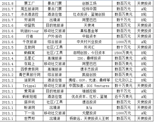 百度:2013年是百度旅游投资收获的一年,此前投资的去哪儿网在2013年上市,二者也将通过新的“知心搜索”在旅游领域做更多的合作。百度2013年还推出了轻应用,和移动旅游相关的开发者深度合作,比如“景点通”。作为流量入口,百度旅游也在2013年进行了改版,一方面完善百度旅行APP、攻略等内容,另一方面则通过整合团购业务,先后推出了酒店、线路等旅游导购服务。