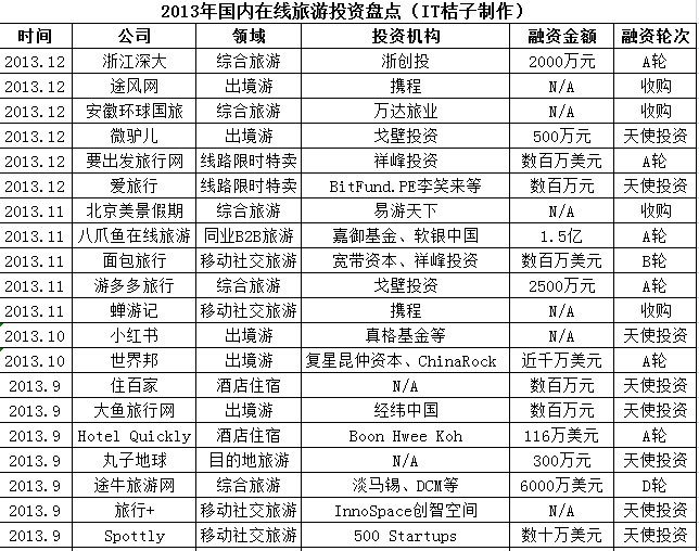 你可以看到,在这个格局和派系中,留给创业公司的地方很多、但又不多。很多是说这8个派系之后都可以加上无数的公司;不多是说太难进入“独立派系”或门槛有些高。IT桔子数据库2013年所统计的41起在线旅游事件,希望其中有突围而出的新公司。