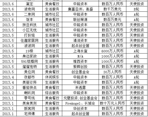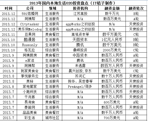 新一波的本地生活服务公司相比此前,路径和做法更多,更垂直、更细分到一些行业,包括家政、家电维修、家居装修、美容美发等领域,刚开始时候可能就一个点;价值深挖上,不再满足于信息、社区、渠道的价值,导流转化率、直接的交易等闭环服务变得更为重要;伴随着劳动力升级及信任支付体系,P2P分享经济模式也开始出现在国内。这个时候,能在任何一个点会垂直领域成为龙头,是创业公司突围的重要标志。IT桔子数据库2013年所统计的41起本地生活投资事件,会让你看到一些有潜力的公司。