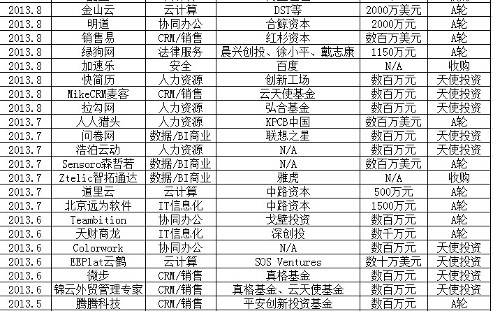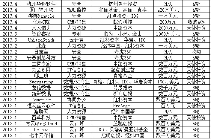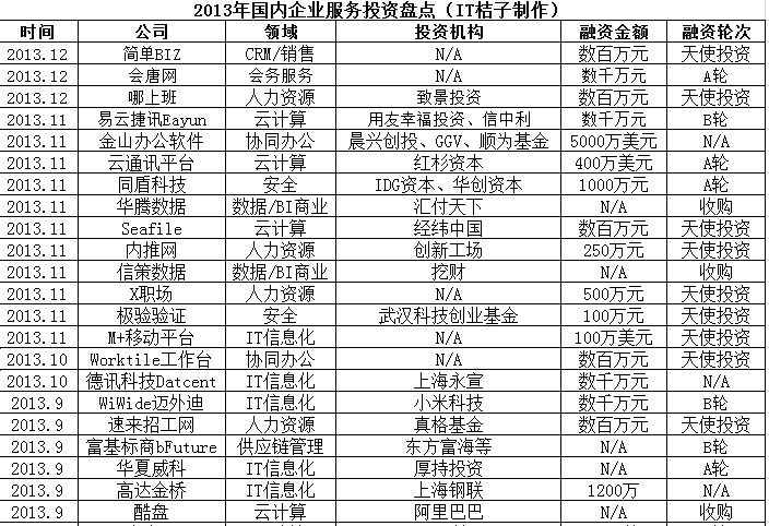 IT桔子非常关注企业服务领域,并且在2013年举行了2期创业投资沙龙,和业内同行一起交流互动。IT桔子数据库在2013年收录了612家企业服务创业公司(热门领域中排名第四,仅次于移动互联网、电子商务、游戏)、67起企业服务相关投资事件(获得投资的热门领域排行榜第四)。
