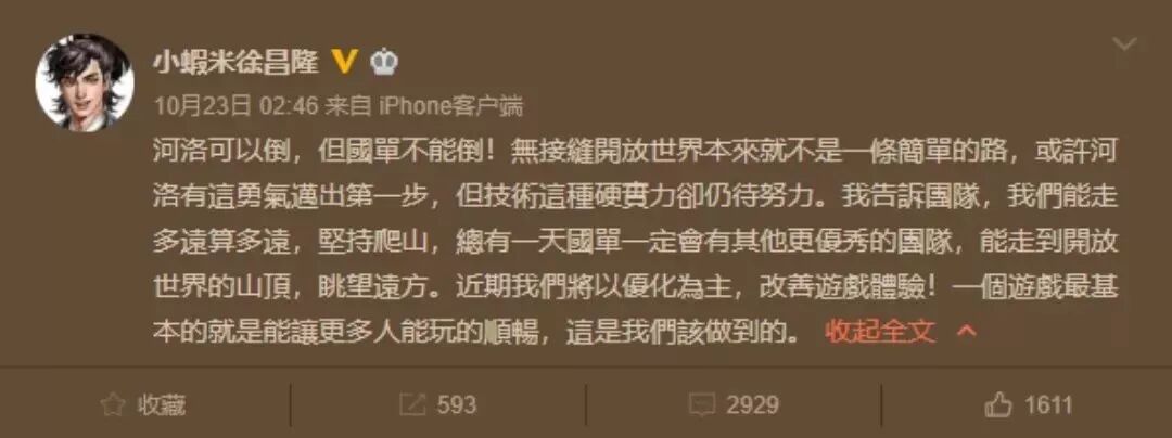重压之下,制作人徐昌隆发布一条微博表明近期将对游戏进行优化,却因为措辞提到国产单机的未来,从而引起了更大的争议。