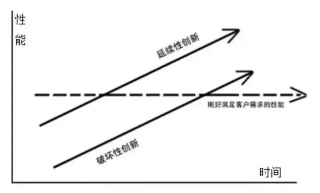 如图1,当延续性创新(靠左边的斜线)随着时间的发展而不断变好,渐渐超过了主流客户需求的时候,颠覆式创新(靠右边的斜线)就注定是要发生的。