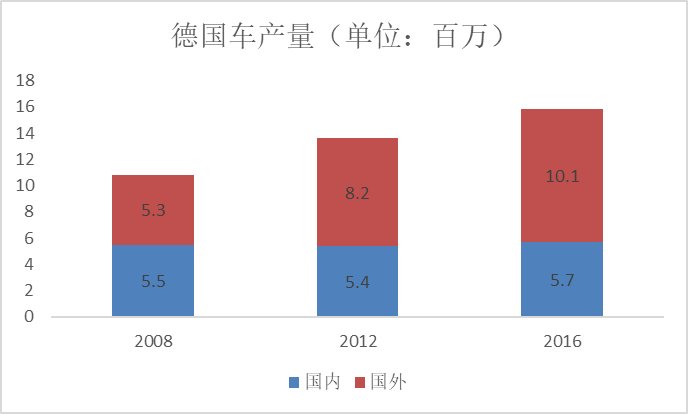 近几年,德国车海外生产比例大幅提升。2008年德国车海外生产比例只有49%,而2016年这一比例提升至64%。
