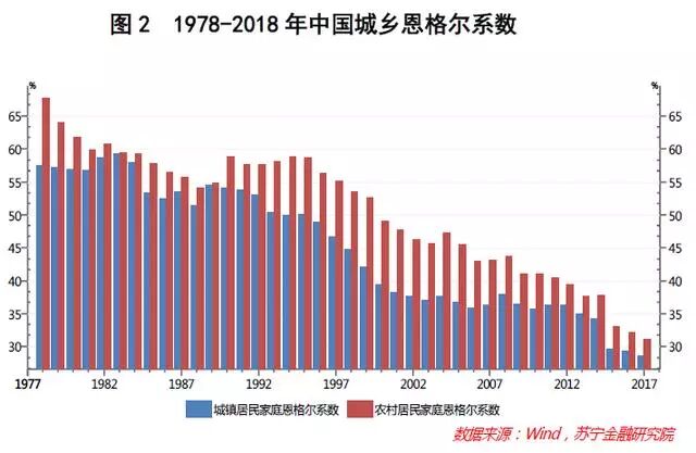 数据显示,自改革开放以来,城乡居民恩格尔系数均呈现出较为明显的持续下降态势。具体而言,中国城镇居民恩格尔系数由1978年的57.5%降至2017年的28.6%,同期的农村居民恩格尔系数由67.7%降至31.2%(参见图2)。