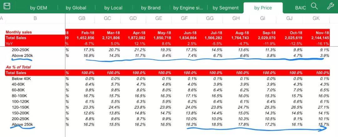 根据美林的汽车行业专题报告,豪华车品牌似乎没有受到行业寒冬的影响,在华销售保持稳定增长。奔驰和奥迪在前11个月累计销售增速在11%以上,宝马虽然前十个月增速不到双位数,但在整体疲弱的11月份,销量迎来超过15%的增长。