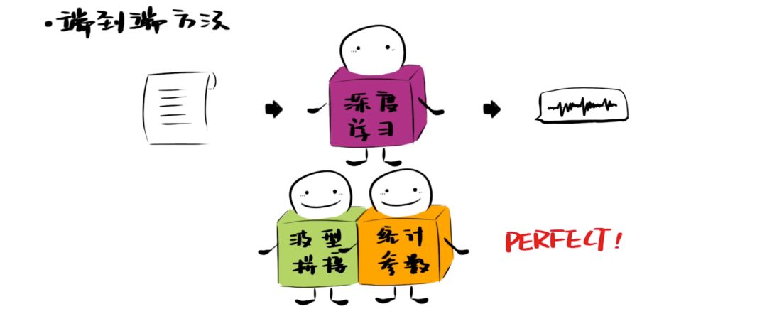 除了这两种方法,人们还在尝试使用深度学习端到端的完成语音合成任务。不过从结果上看,还是将前两种方法融合起来效果比较好。